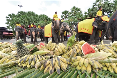 当日是泰国一年一度的大象日,芭堤雅东芭乐园在这一天为大象奉上了丰盛的水果自助餐。 新华社发
