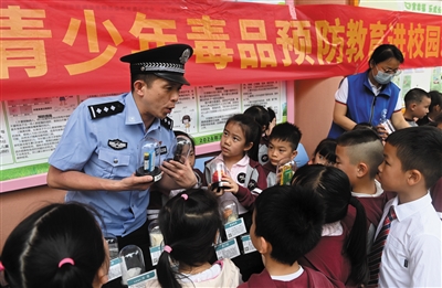 ▲3月25日,在广西壮族自治区直属机关第三幼儿园,公安民警在为学生进行禁毒宣传。