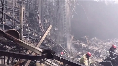 这张俄罗斯紧急情况部3月23日发布的视频截图显示,救援人员在现场工作。 新华社发