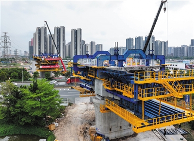 3月31日,中铁建大桥局运用全线首台多功能悬臂智慧造桥机,浇筑完成深江铁路跨105国道沙溪特大桥首节连续梁。