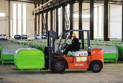 左云县山西耀邦环境装备工程有限公司是一家环卫装备制造企业,以先进的产品生产工艺及严格的质量管控蜚声业内,年产环卫车辆与装备7400台(套)。图为日前,工人正在搬运生产好的环卫设备。 本报记者 张占兵 摄
