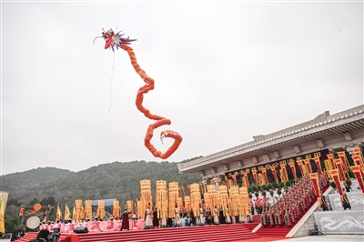 在盛大乐舞告祭中,一条长56米的“金色飞龙”从祭台中心盘旋腾跃而起,表达龙腾盛世、福佑中华的美好祈愿。