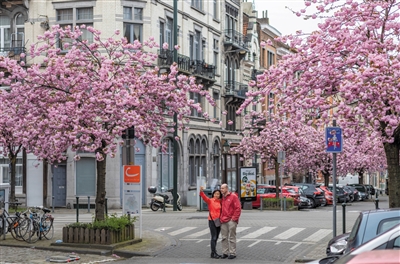 ▲4月5日,人们在比利时布鲁塞尔一处樱花盛开的街道自拍。