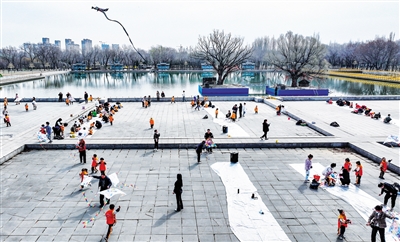 明媚春光中,一群幼儿园的小朋友来到这里游玩,在老师的带领下,孩子们或趴在地上用画笔装点风筝,或趁风奔跑试图放起风筝,尽情感受户外活动的快乐。
