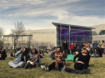 ▲ 4月8日,人们在加拿大首都渥太华的航空航天博物馆附近观看日食。