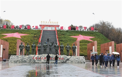 图为4月10日,来自河北的游客在雨中参观平型关大捷纪念馆,近距离感受红色文化。 本报记者 于宏 摄