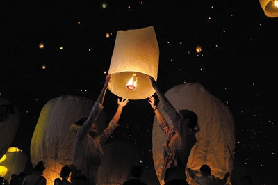 4月13日晚,在云南省西双版纳傣族自治州景洪市,人们在澜沧江边放飞孔明灯,庆祝泼水节。 新华社发