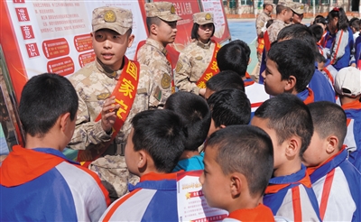 ▲4月12日,新疆军区某火力团组织官兵走进驻地小学进行国家安全教育基本知识普及。