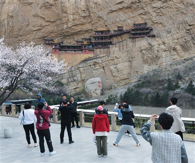 “五一”假期临近,我市文旅消费市场已经热起来,各地游客热情高涨,纷纷来同游览观光。图为近日在悬空寺景区,参观游览的游客络绎不绝。