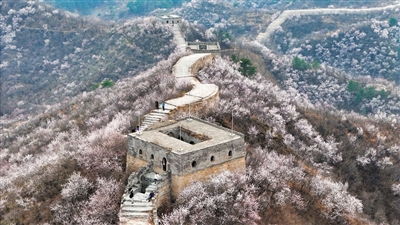 春日里,长城如巨龙在山间蜿蜒,城墙内外山花烂漫,胜景引人。
