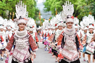 ▲4月21日,苗族群众参加台江苗族姊妹节盛装游演。