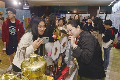 图为大学生在我市展位前拍照留念。