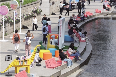 ◀ 4月19日,人们在韩国首尔市的清溪川边的露天图书馆读书、休闲。