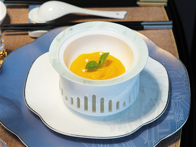 奶香南瓜露是一道老少咸宜的甜品,将优质南瓜蒸熟,加淡奶油、白糖打成泥,加素燕窝,点缀薄荷叶即可。何为素燕窝?金御满棠·宴府的厨师告诉记者,素燕窝与燕窝有相同的质感和口感,是一种长在树上的植物燕窝。奶香南瓜露营养丰富,香甜可口,甜而不腻。