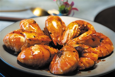 黑松露焗黑虎虾,选用四头黑虎虾,加黑松露酱,采用焗的烹饪技法进行烹制。此菜虽然制作过程简单,但成菜让人眼前一亮,十分惊艳。盖子掀开,虾蜷曲成椭圆形蛋状,红色的外壳像玻璃一样透着光亮,酥脆感扑面而来。去掉虾壳,虾肉脆嫩Q弹,咸鲜味美,滋味十足。