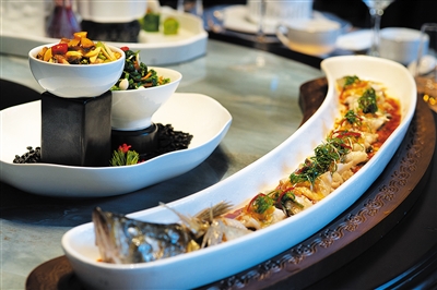 金御满棠·宴府建筑面积1000多平方米,可同时容纳260人用餐。菜品以大同地方特色为主,以粤菜、淮扬菜等精美菜肴为辅。采访中,金御满棠·宴府的大厨们向“寻味大同”展示了两道热菜、一道甜品、一道主食。