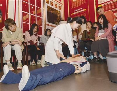 图为医护人员现场演示心肺复苏的操作步骤。 本报记者 戎禹仁 摄