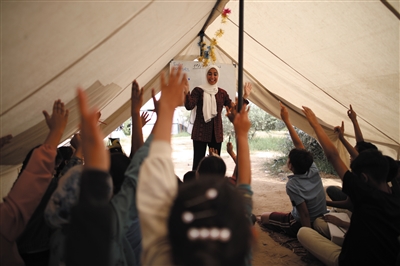 ▲4月26日,在加沙地带中部城市代尔拜拉赫,孩子们在一处用帐篷搭建的临时教室内上课。 新华社发