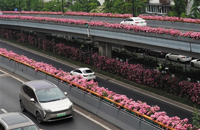 ▲杭州中河高架匝道旁盛放的月季花(4月28日摄)。