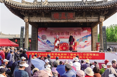 ◀ 3日,大同市北路梆子和耍孩剧种保护传习中心在关帝庙广场演出传统耍孩儿剧《刘家庄》,让众多戏迷过足了戏瘾。 本报记者 于宏 摄