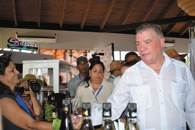 ▲5月2日,古巴旅游部长加西亚(右一)在谢戈德阿维拉省举行的第42届古巴国际旅游博览会展区同参展商交谈。