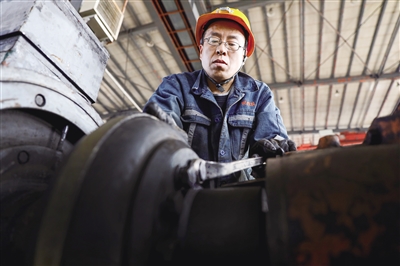 图为工作人员正在维修综采液泵。 本报记者 韩堃 摄