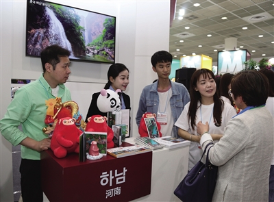 ▲ 5月9日,在韩国首尔举行的首尔国际旅游展上,参观者在中国展区咨询。