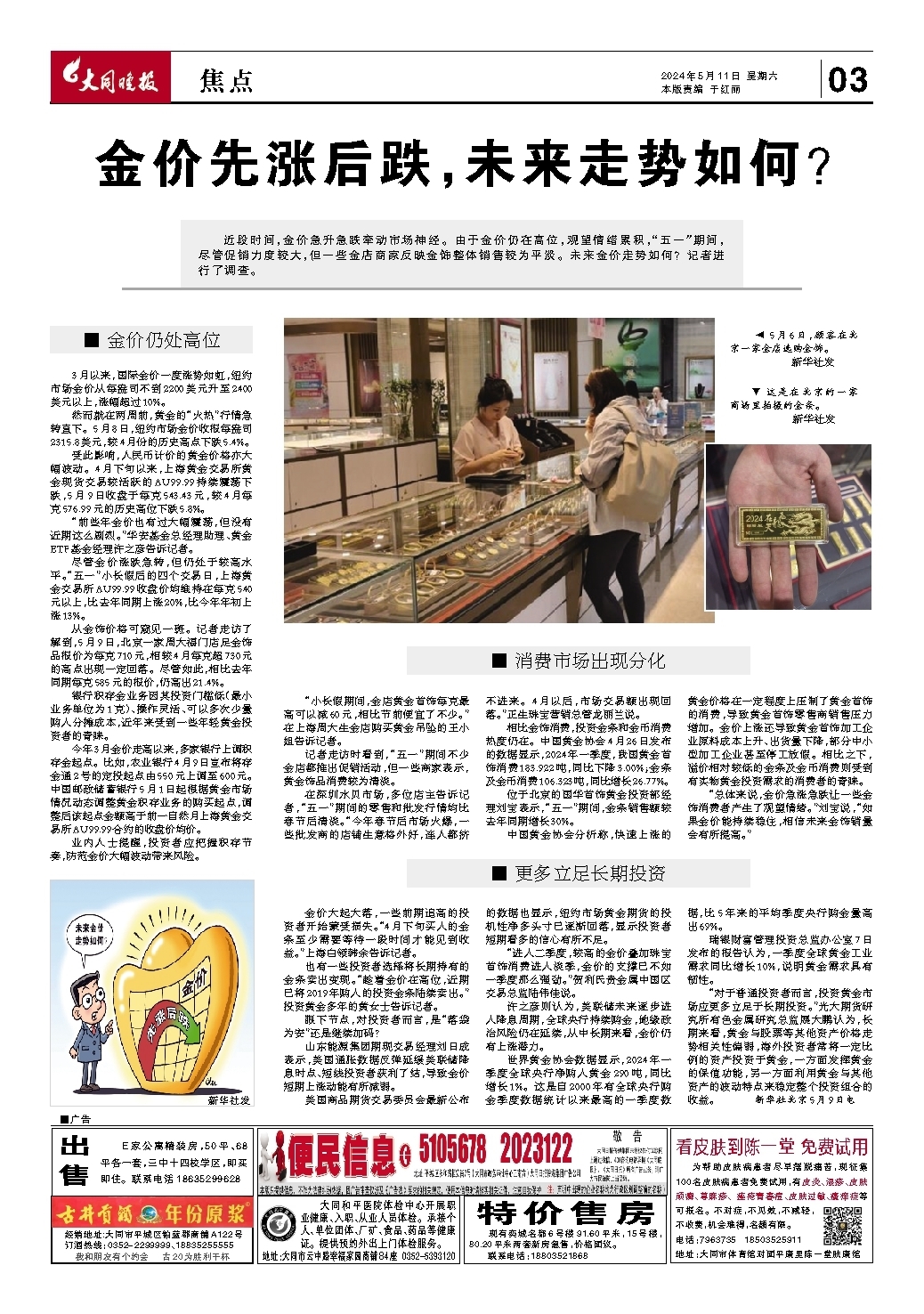 ~~~近段时间,金价急升急跌牵动市场神经。由于金价仍在高位,观望情绪累积,“五一”期间,尽管促销力度较大,但一些金店商家反映金饰整体销售较为平淡。未来金价走势如何?记者进行了调查。