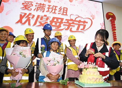 母亲节来临之际,中铁建工青岛北站一项目部开展“爱满班组,欢度母亲节”主题活动,为工作在建设项目一线的“工地妈妈”送上节日的祝福。 新华社发