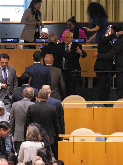 巴勒斯坦常驻联合国观察员曼苏尔在投票前表示,人们必须做出决定:支持一个民族在其祖先的土地上自由而有尊严地生活的权利,支持和平并承认巴勒斯坦人的权利。“投赞成票就是对巴勒斯坦存在的支持,这并不是针对任何国家……这是一种对和平的投资。”他的讲话赢得一片掌声。