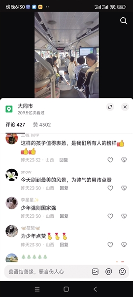 自5月12日19时56分“公交男孩”的视频发布后,在不到一天的时间里,浏览量达25万余次,点赞4000多次,有400多名网友留言。“大同好后生”“人间处处是温暖,这是个有爱有温暖的少年”“今天刷到最美风景,为帅气的男孩点赞”“公共环境需要大家一起献爱心,必须给这种行为点赞!”“你擦干净了车厢,也擦亮了城市文明的名片。”……