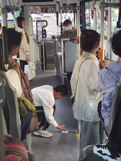 5月12日晚,一名网友通过抖音平台发布了一条视频,并配文写道:“42路公交车上看到了感人的一幕:临近大同二中站,有一个小朋友可能晕车,吐了一地。小朋友和她的家人恰好到站,来不及收拾呕吐物就下了车。当时车厢乘客较多,突然有一名学生(可能是中学生)拿出仅有的一点纸巾开始清理起来……”这名网友告诉记者,12日下午6时许,她乘坐42路公交车时,偶遇了这样感人一幕。在男孩清理呕吐物时,她用手机将这瞬间定格。“大人都很难做到的事情,孩子竟然做到了!”这位网友说,这个孩子的举动是我们每个人学习的榜样。