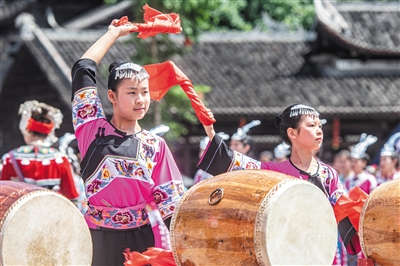 ◀5月15日,苗族同胞在重庆市彭水苗族土家族自治县的蚩尤九黎城庆祝传统节日。