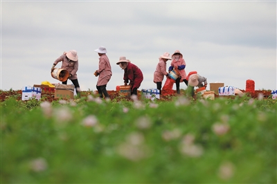 ▲5月15日,在陆良县小百户镇普乐村委会高效农业示范基地,农民在采收小春马铃薯。