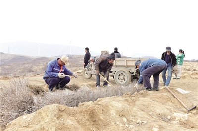 4月初记者第一次来岭底村时,薛永带着40余名村民在沙棘种植基地栽种沙棘树苗。薛永告诉记者,这些树苗是刚从河北承德引进的,雌雄同株、萌芽率高、成枝力强、果粒紧凑,两年后就可以大量挂果,八年株能产沙棘果20公斤以上,亩产可达2000公斤,经济效益极为可观。
