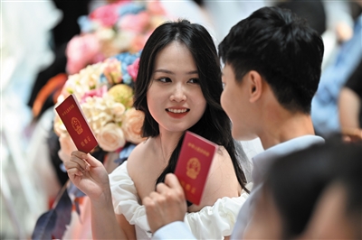 5月20日是寓意“我爱你”的日子,许多新人选择在这一天登记结婚,以此见证美好的爱情。 新华社发
