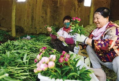 近日,云州区瓜园乡沙窝村芍药种植园内,芍药比往年开得更早些,工人们正忙着剪下花枝打包,准备发往客户手中。