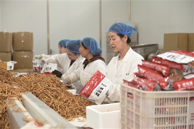图为近日,在坊城新村的黄花产业园生产车间,村民们正在打包黄花菜。