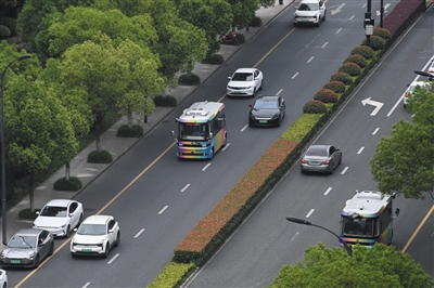 ▶5月22日,自动驾驶接驳示范线巴士行驶在杭州余杭未来科技城的道路上。