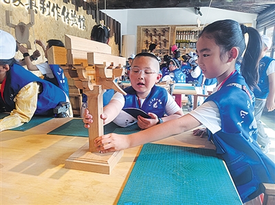 作为2024年古城文化旅游新亮点,位于大同古城东南邑广府角七号的灵丘院,占地约900平方米,建筑装修风格以“红色灵丘”“古色灵丘”“有机灵丘”为主线,各展厅陈列展示突出灵丘人文及地域特色,是集声、光、电、实物展示为一体的展览馆。活动当天,小记者们跟随讲解员首先深入灵丘院有机食品市肆,互动交流这方水土的特色产品。之后,参观非遗文化展示区,小记者们通过灵丘县的传统文化和非物质文化遗产展现,对罗罗腔、灵丘打铁花等有了深刻了解;红古灵丘展示区内,观看平型关、桃花山等当地历史文化景点的展示,加深了他们对灵丘革命历史文化的了解;在木工体验坊和茶馆等处,该院特别邀请木工专业学生带领小记者们体验参观,帮助他们了解更多非遗文化。