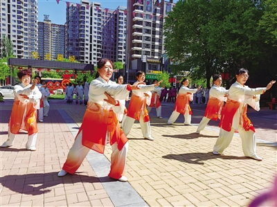 ▲ 近日,平城区文瀛湖街道华北星社区联合市养生太极协会开展养生太极、健身气功等传统体育项目进社区活动,丰富居民精神文化生活,推进全龄康养社区建设。 本报记者 郑林