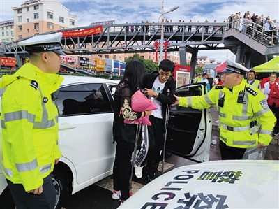交警六大队民警同样开辟爱心助考绿色通道,将坐轮椅的考生送到考点门口,并搀扶考生进入考场,考试结束后又将考生接出考场。