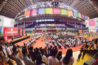 8时30分,鲜艳的五星红旗在雄壮的国歌声中冉冉升起。伴随着毕业生们热烈的掌声和热切的目光,毕业典礼开始。学校领导为优秀毕业生代表、研究生科技创新优秀个人、本科生“学霸宿舍”“学霸班级”等颁奖。握手、拨穗、授证,同学们接过学位证书,开启新的旅程。