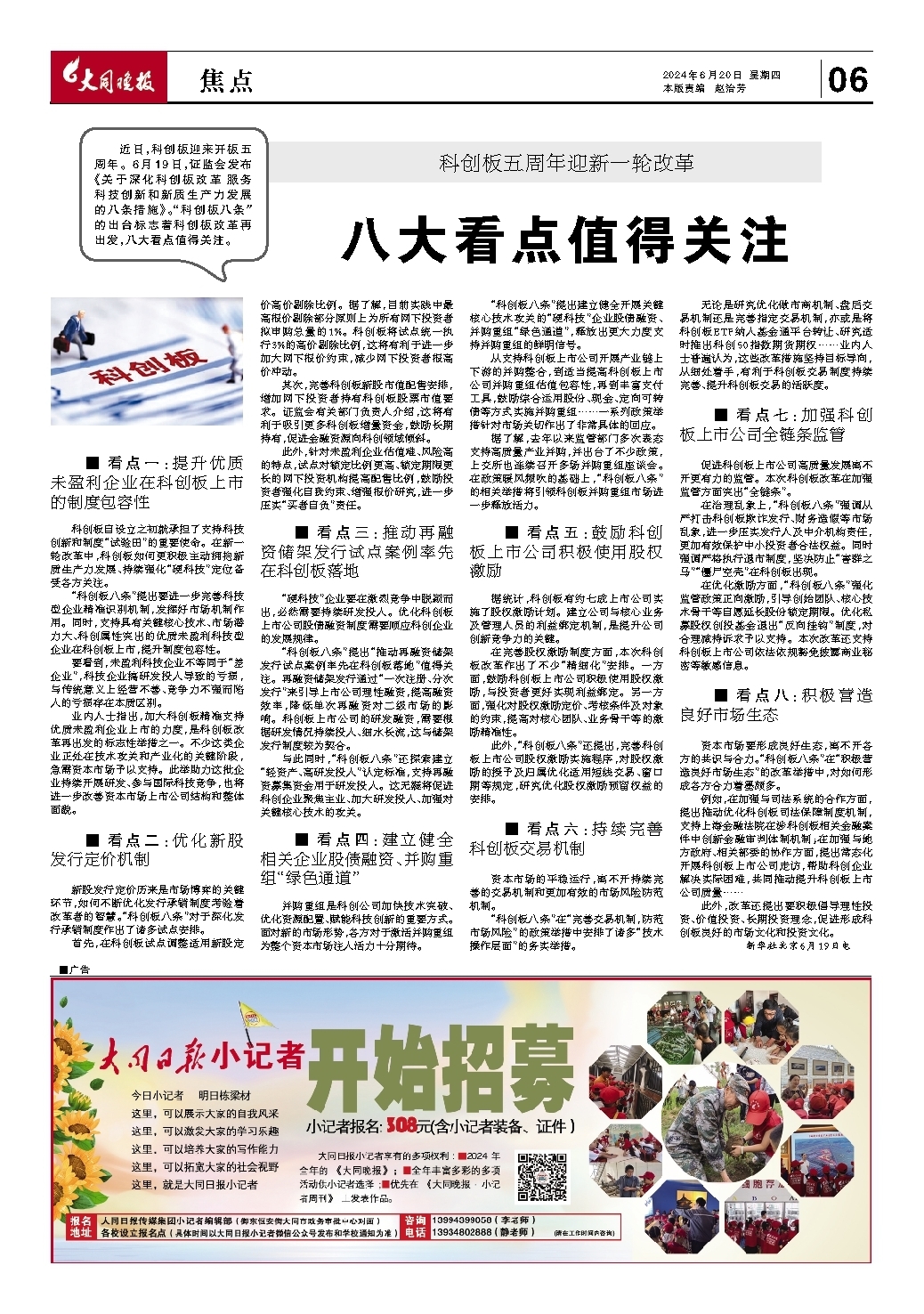 科创板五周年迎新一轮改革~~~近日,科创板迎来开板五周年。6月19日,证监会发布《关于深化科创板改革 服务科技创新和新质生产力发展的八条措施》。“科创板八条”的出台标志着科创板改革再出发,八大看点值得关注。