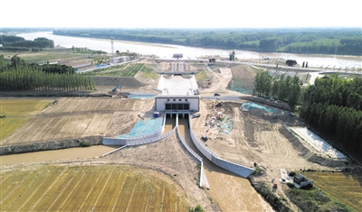▲ 6月19日,位于黄河高青段的马扎子引黄闸在开闸引水(无人机照片)。