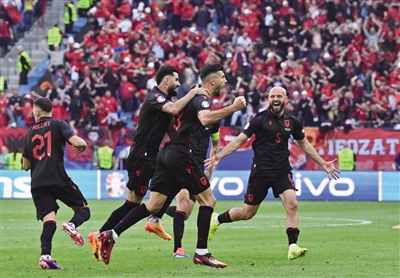6月19日,阿尔巴尼亚队球员贾苏拉(右二)进球后与队友庆祝。