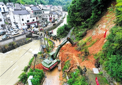 ▲ 6月24日,在安徽省黄山市歙县绍濂乡清溪村,武警官兵驾驶挖掘机疏通道路(无人机照片)。