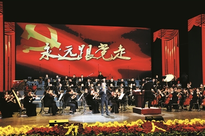 27日晚,由市委宣传部、市文旅局主办,市歌舞剧院、市大剧院管理中心、市文化馆承办的“向党献礼 为人民放歌”大型交响音乐会在大同大剧院精彩上演。图为男高音独唱《跟你走》。 本报记者 韩堃 摄