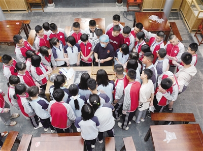 作为全国中小学生研学实践教育大同营地,广盛原中医药文化博物馆开设了《身边的中药》《传统大蜜丸加工技艺》等课程,对中小学生熟悉中医理论、学习传统文化起到了重要作用,目前已累计接待研学学生5000余人次。图为 26 日,研学学生体验大蜜丸的制作。