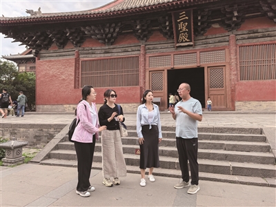 当天上午,梁周洋一行来到华严寺,聆听当年梁思成一行调查华严寺建筑的情景,栩栩如生的鸱吻、图案精美的平棊和藻井、富有神韵的合掌露齿菩萨,以及被梁思成誉为“海内孤品”的重楼式小木作壁藏及天宫楼阁等,吸引大家驻足观赏。下午,大家来到善化寺,形似怒放花朵的斜拱、古朴庄重的大雄宝殿、表情生动的彩塑等,让人感叹建筑之恢弘精美。